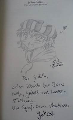 Das eine – „Am Fuß des träumenden Berges“ – ist ein unangefordertes Rezensionsexemplar. Wie das? Vor einiger Zeit hat die Autorin, die ich aus dem Tintenzirkel kenne, dafür gesorgt, dass mir „Das Lied der Sonnenfänger“ zugesandt wurde und seither schickt mir der Verlag stets ihre neuen Romane. Das ist einerseits erfreulich, andererseits fühle ich mich aber schon wieder unter Druck gesetzt – umso mehr, da mir das sogenannte „Love and Landscape“-Genre nur in sehr kleinen Dosen liegt, also so etwa alle drei Jahre mal. 😉 Bei dem anderen Roman handelt es sich um ein ganz besonders Schätzchen, da ich Julianes „Die lebenden Träume“ in zwei verschiedenen Fassungen betagelesen habe und mich riesig darüber freue, dass dieses wunderbare Kinderbuch sein Plätzchen gefunden hat. Mein Überraschungsexemplar kam mit einer tollen Signatur samt Zeichnung – und auch sonst ist das ein richtiges kleines Schmuckstückchen mit den süßen Kapitelillustrationen.