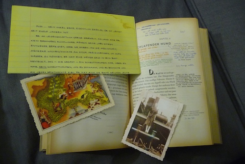 Dieser Roman, der auf Englisch bereits 2013 erschienen ist und sich seither auf meiner Wunschliste tummelte, hat im vorigen Jahr beim Erscheinen für viel Aufsehen gesorgt. Es handelt sich dabei um ein ganz besonderes Buch, das jedes bibliophile Herz schneller schlagen lässt: In einem Schuber befindet sich – versiegelt – das vermeintlich alte Bibliotheksexemplar von „Das Schiff des Theseus“. Vom Fake-Leineneinband über die vergilbten Seiten bis hin zur Signatur und dem Bibliotheksstempel erweckt es tatsächlich den Eindruck eines schon in die Jahre gekommenen Buches. Und als ich es erst einmal durchblätterte, stieg meine Begeisterung noch. Abgesehen von unzähligen mehrfarbigen Notizen an den Seitenrändern von Jen und Eric findet sich im Buch noch eine Reihe von Zusatzmaterial: Briefe, Postkarten, ein auf eine Serviette gezeichneter Plan, Zeitungsausschnitte und vieles mehr.