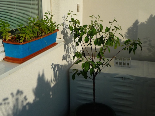 Leider tut sich beim Apfelbaum bislang nichts mit Blüte – bin mir nicht so sicher, ob sich der bei mir am Balkon wohlfühlt. Aber vielleicht muss er sich erst mal ein Jahr einleben und legt dann im nächsten Jahr los.