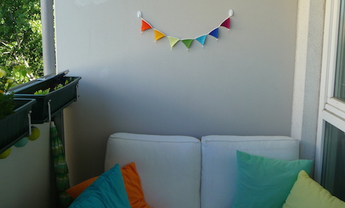 Die Wimpelkette macht sich richtig schön auf deinem Balkon. Sieht toll aus und passt so gut zu deinen Kissen. Dein Balkon sieht überhaupt total gemütlich aus.