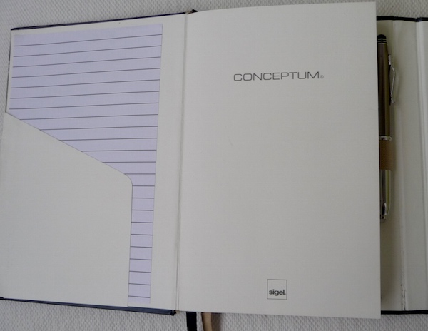 Mein diesjähriger Kalender ist ein Conceptum-Notizbuch in A5 mit zwei Lesebändchen, einer Stiftschlaufe und einer Einlegetasche jeweils vorne und hinten: