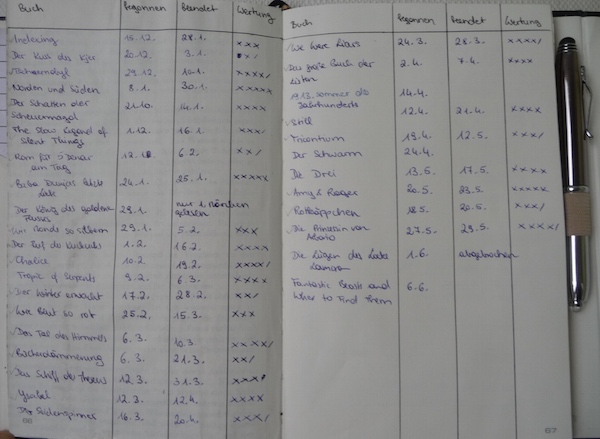 Außerdem lege ich auch immer eine kleine Rezensions-To-Do-Liste mit Bleistift an – sobald ich dann ein gelesenes Buch rezensiert habe, wird es einfach wegradiert.