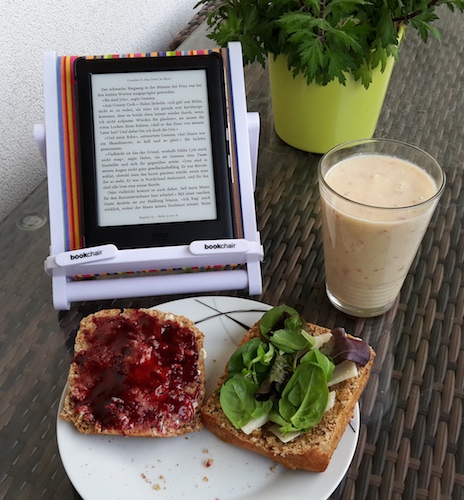 Ich habe auch auf dem Balkon gefrühstückt, aber es war doch ziemlich kalt, selbst mit Decke. Mal sehen, ob ich das morgen wiederhole. Heute früh gab es wenigstens etwas Sonne, inzwischen ist es bedeckt. Mal sehen, wie es morgen aussehen wird. Dein Vollkornweckerl sieht sehr lecker aus und den ebook-reader-Halter finde ich sehr witzig; er erinnert mich an die Stoff-Klappstühle für Balkon, Garten oder Terrasse meiner Kindheit.