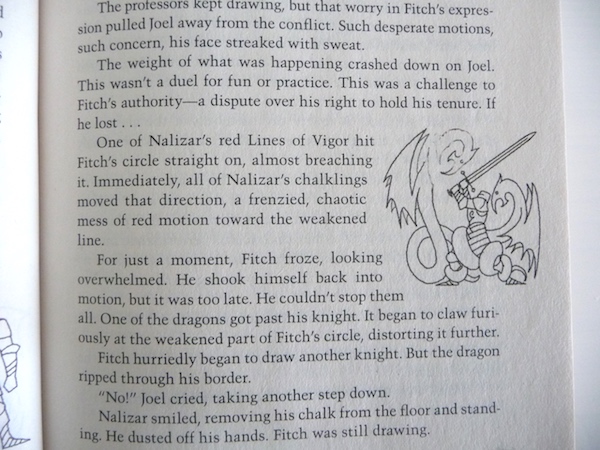 Das Magiesystem in diesem Buch ist sehr originell und von Sanderson bis ins Detail ausgearbeitet. Ich hatte zunächst Probleme damit, mir alles vorzustellen, vor allem bei den Übungsduellen zwischen den Rithmatisten, aber das Buch enthält zahlreiche Bilder von Ben McSweeney, die klar illustrieren, wie die Kreidezeichnungen aufgebaut sind und wie sie funktionieren.