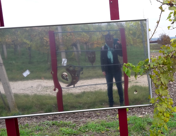 Nach dieser Ladung an Kultur sehnte ich mich noch nach etwas Natur und machte mich auf zum Dionysosweg. Dabei handelt es sich um einen Themenweg, der durch Weingärten, über Äcker und vorbei an Viehweiden führt. Von den Obstspalieren darf man ausdrücklich naschen und zwischendurch gibt es immer wieder auch Stationen zu den Themen Dionysos und Sinne.