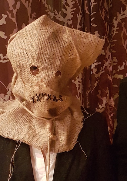 Und das hier ist die Halloween-Maske, die ich gebastelt habe (Scarecrow aus „Batman Begins“). Der Hund hat auf jeden Fall bei der Feier vor mir Reißaus genommen: