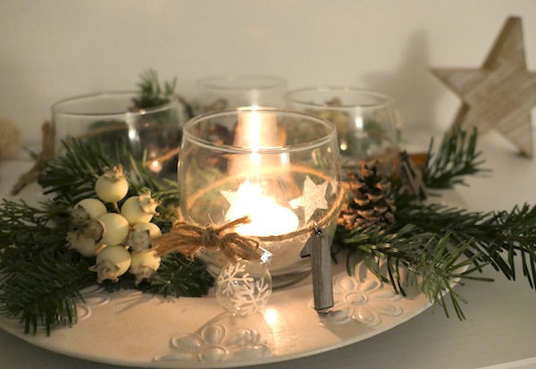 Hier habe ich gleich meinen traditionellen „Adventsteller“ mit vier Gläsern und Teelichtern dekoriert. Ich wollte dieses Jahr eigentlich mal etwas neues gestalten, aber durch den unvermutet frühen Aufbruch zur Dienstreise Montag hatte ich dazu keine Gelegenheit mehr.