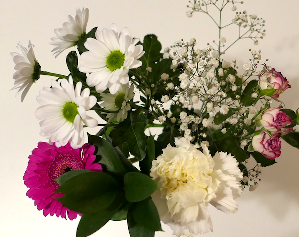 Chrysantheme. Gerbera, Nelke, Rose & Schleierkraut deuten aber schonmal auf die wärmere Jahreszeit. Selbst die Eule scheint sich in Richtung der Frühlingsecke zu neigen.