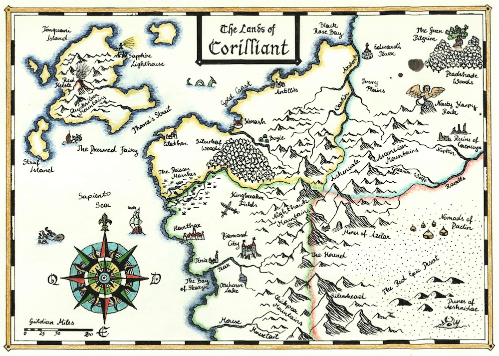 Apropos Karte: Im März/April habe ich an einer Challenge der Cartographer’s Guild teilgenommen bei der es darum ging, eine Karte nur mit Namen von Mitgliedern zu benennen. Für mich war das eine schöne Gelegenheit, einfach mal eine „Klischee-Fantasykarte“ auszuprobieren und zum ersten Mal seit Jahren auch wieder zu Feder und Tusche zu greifen. Und ich hatte so einen unglaublichen Spaß mit der Karte!