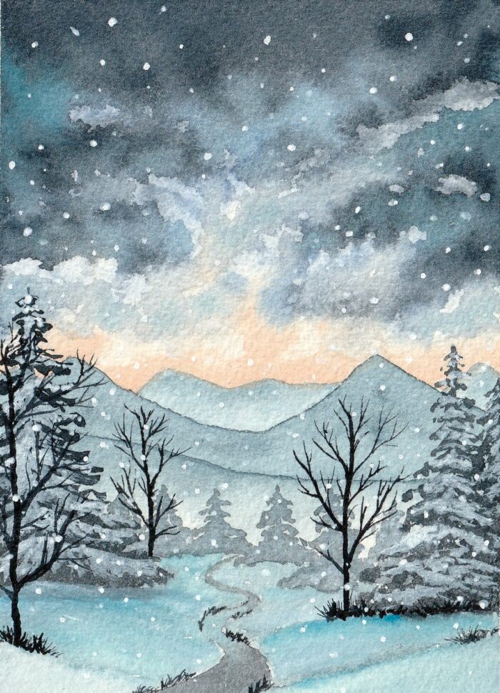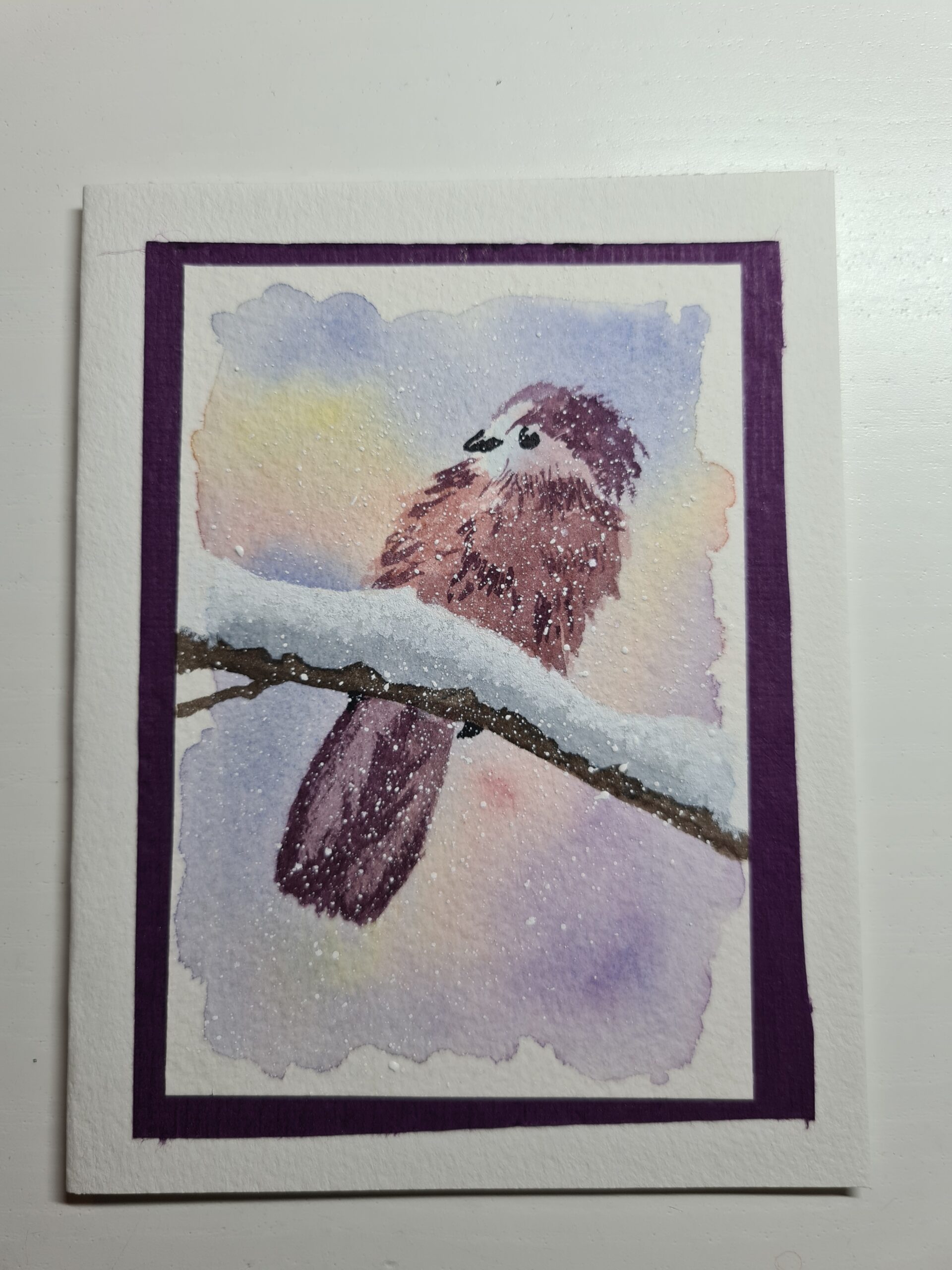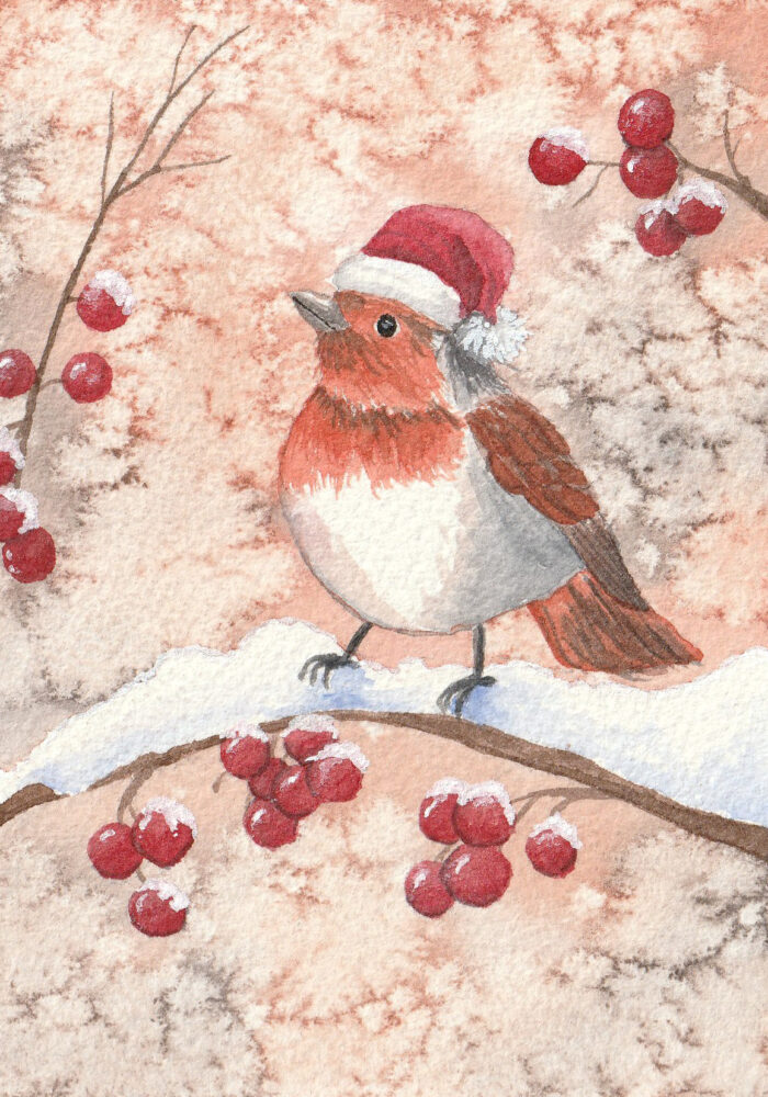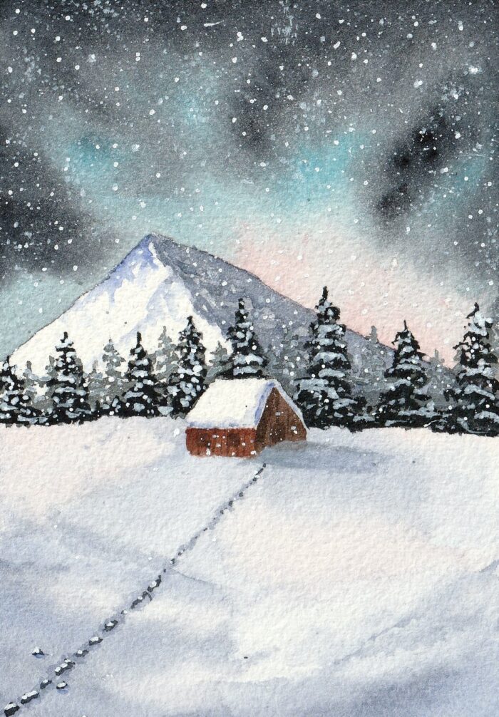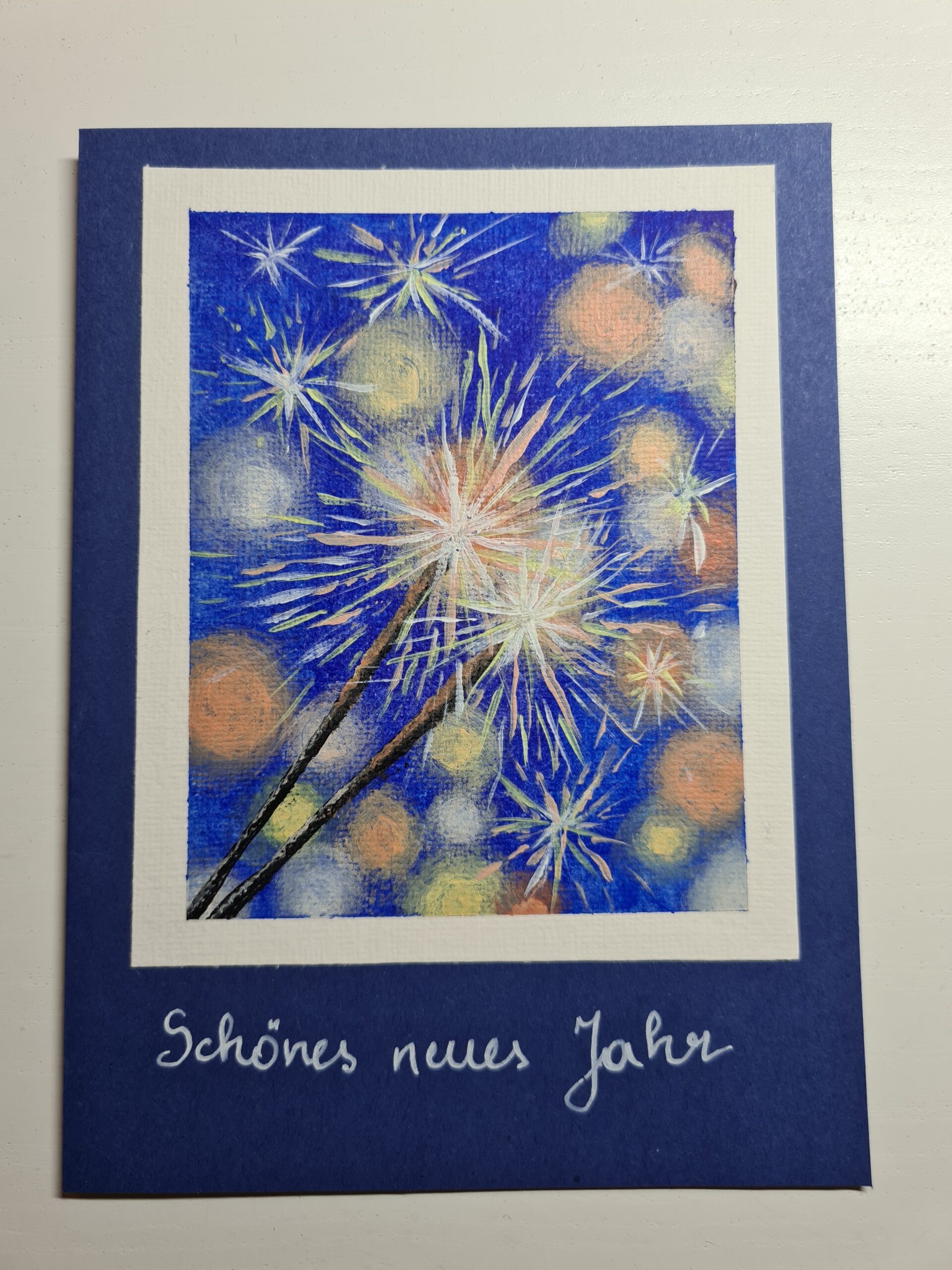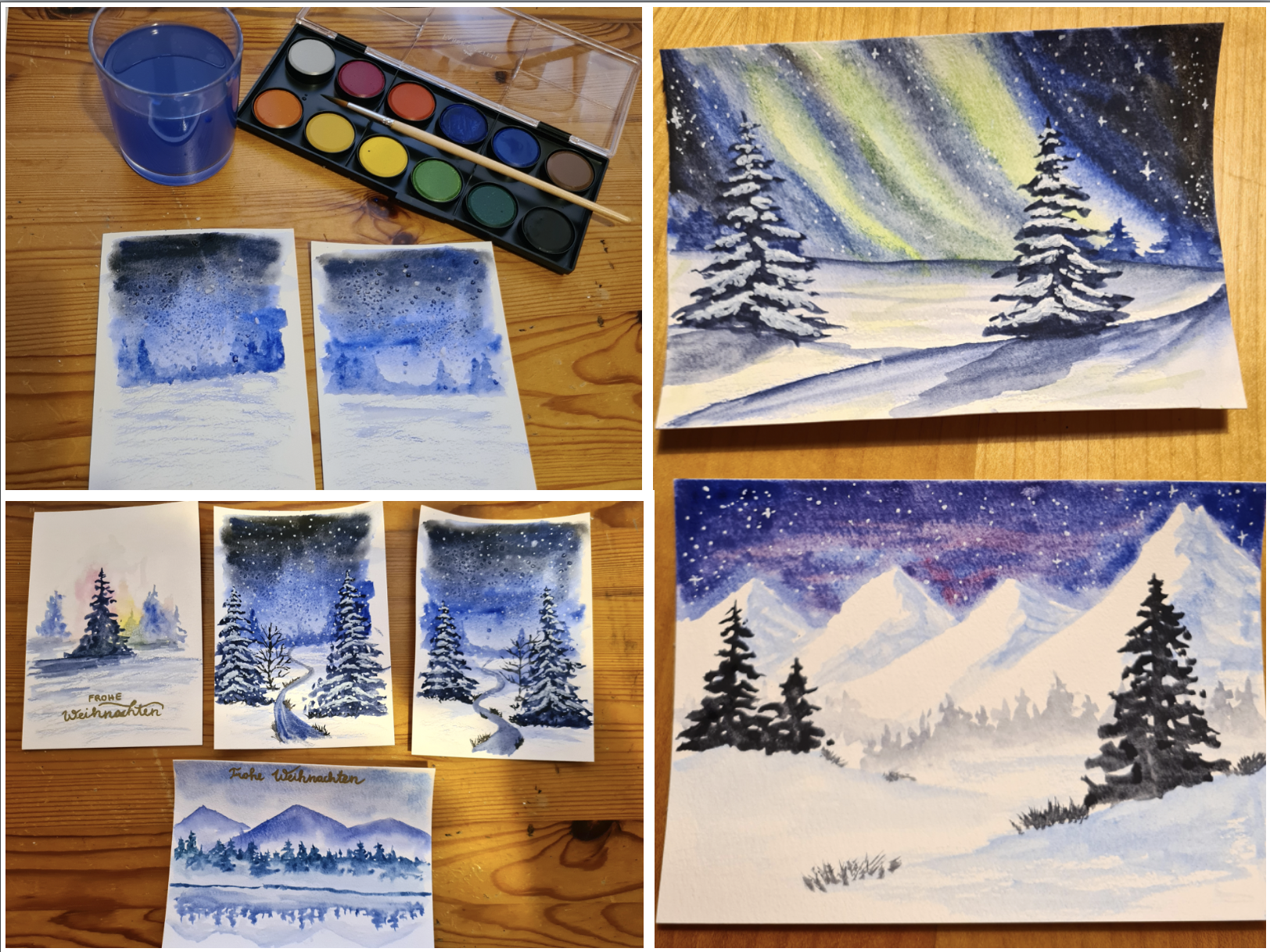 Nach all den Vorbereitungen für den Basar und da ich auch noch mit einem Kalender als Weihnachtsgeschenk beschäftigt war, wollte ich ansonsten auf das Malen von Weihnachtskarten verzichten. Am 24.12., als ich bereits bei meiner Familie war, wollte ich aber in der Früh kurzfristig zumindest noch Karten kaufen. Nur waren alle Weihnachtskarten aus – und ich hatte keinerlei Malsachen mit dabei. Also habe ich spontan im Ramschladen einen Aquarellkasten um 2 Euro und einen Block mit Aquarellpostkarten gekauft. Und dann habe ich den ganzen Vormittag mit Malen verbracht.