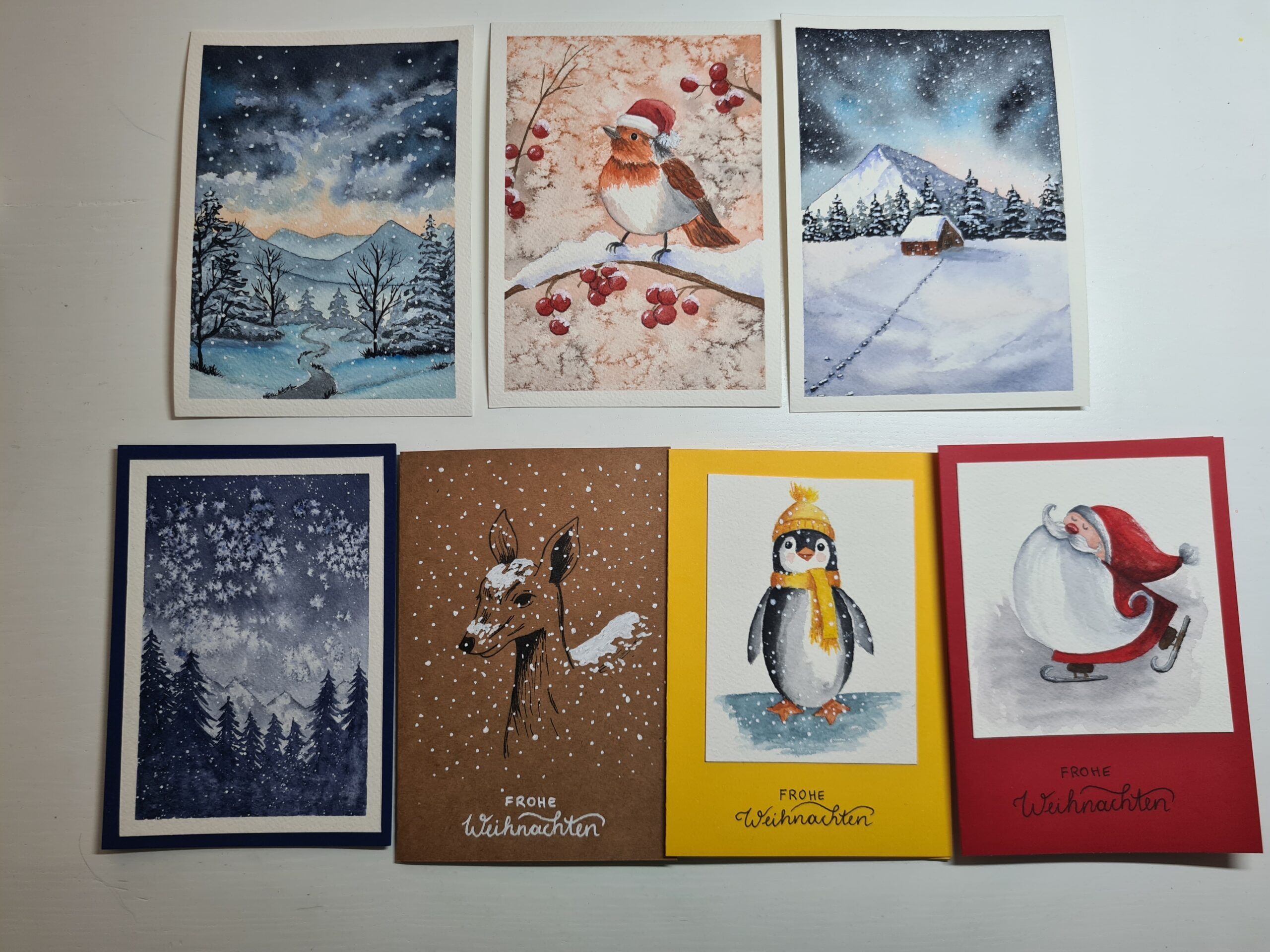 Dieses Jahr hatte ich die (spontane) Gelegenheit im Dezember einen Stand bei einem kleinen Basar zu gestalten. Ich habe dort einige Knüpfereien (die teils bereits aus den letzten Jahren fertig waren) und Häkelanhänger angeboten und recht kurzfristig beschlossen, dass ich auch einige Weihnachtskarten malen wollte. Letztendlich hätte ich den Karten mehr Zeit als den Handarbeiten widmen sollen, denn während ich auf meinen Knüpfwerken gänzlich sitzengeblieben bin, habe ich von den insgesamt zwölf Karten alle verkauft.